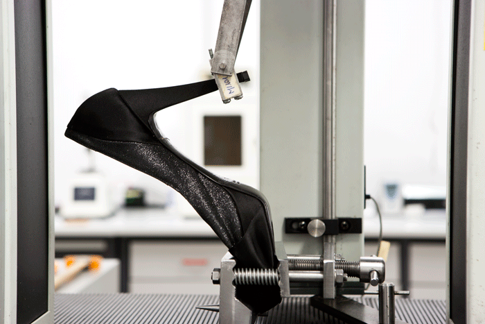 Prova di distacco del tacco con dinamometro. Lo strumento esegue anche prove di trazione, compressione, lacerazione, carico di rottura e allungamento.