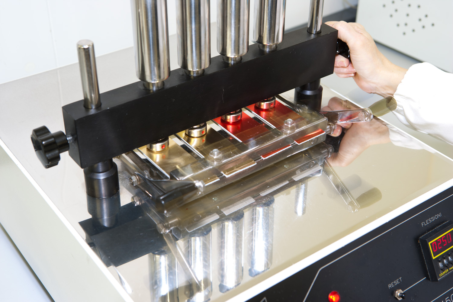 Il laboratorio meccanico è dotato dei macchinari più moderni per verificare le caratteristiche di prestazione e resistenza di pelli, tessuti e prodotti finiti.